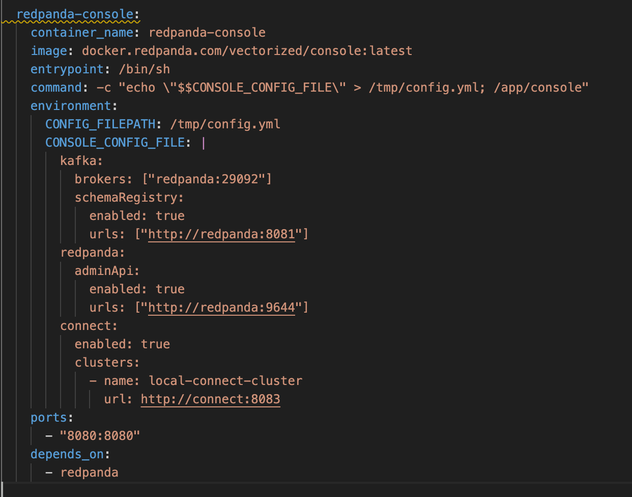 CONFIG_STORAGE_TOPIC,OFFSET_STORAGE_TOPIC,STATUS_STORAGE_TOPIC. The main purpose of these environment variables is managing the internal operations of Kafka Connect, which are compacted topics that work seamlessly with Redpanda. - The