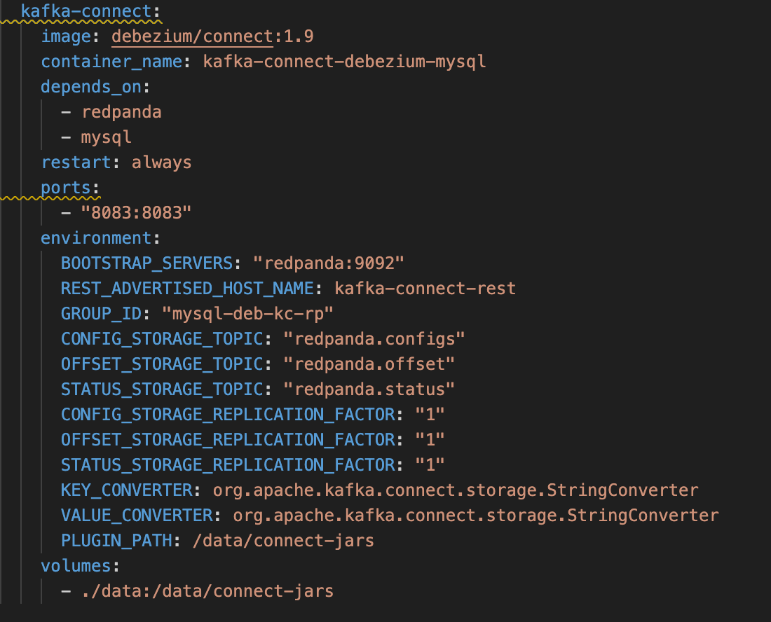 kafka-connect service definition uses Debezium's official Docker image to pull the Kafka Connect image. It listens on port 8083 for the incoming requests.