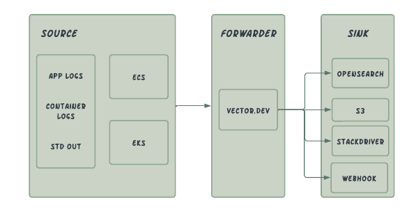 Each ECS/EKS Cluster is deployed with Vector agent as Daemon services and receives the log from each task(ECS) & pods(EKS). Agent does the following