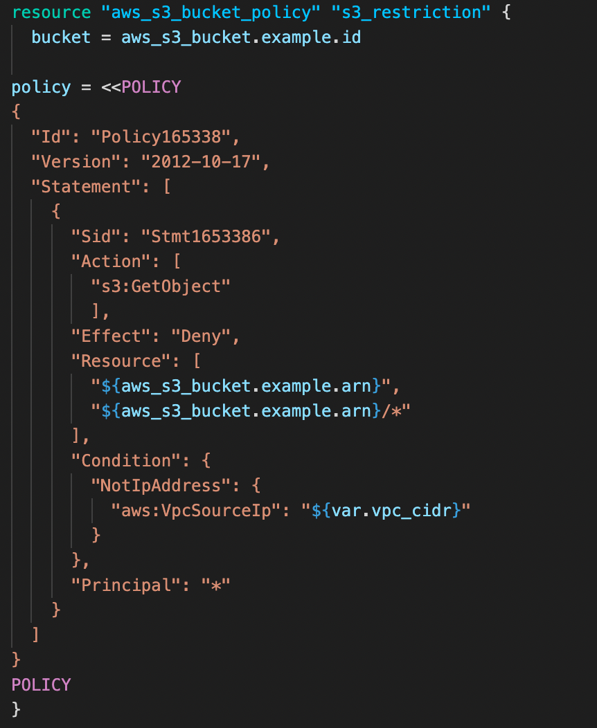 After creating the bucket, we can add the bucket policy similar to the snippet below. Pass the bucket_id from the bucket created into aws_s3_bucket_policy resource so that the policy refers to the bucket that was previously created.
