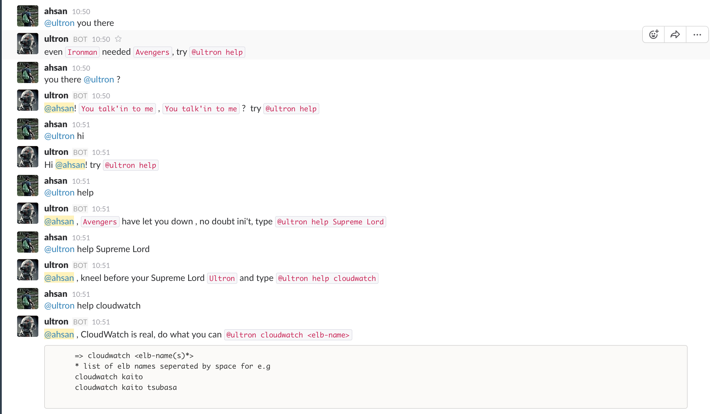 Ultron is quite well known for its dedication to conquests and exterminations. So there was no better name for our Slack Bot that is to find the AWS EC2 instances that are not performing well by either with low or high CPU Utilisation compared to others behind an ELB.
