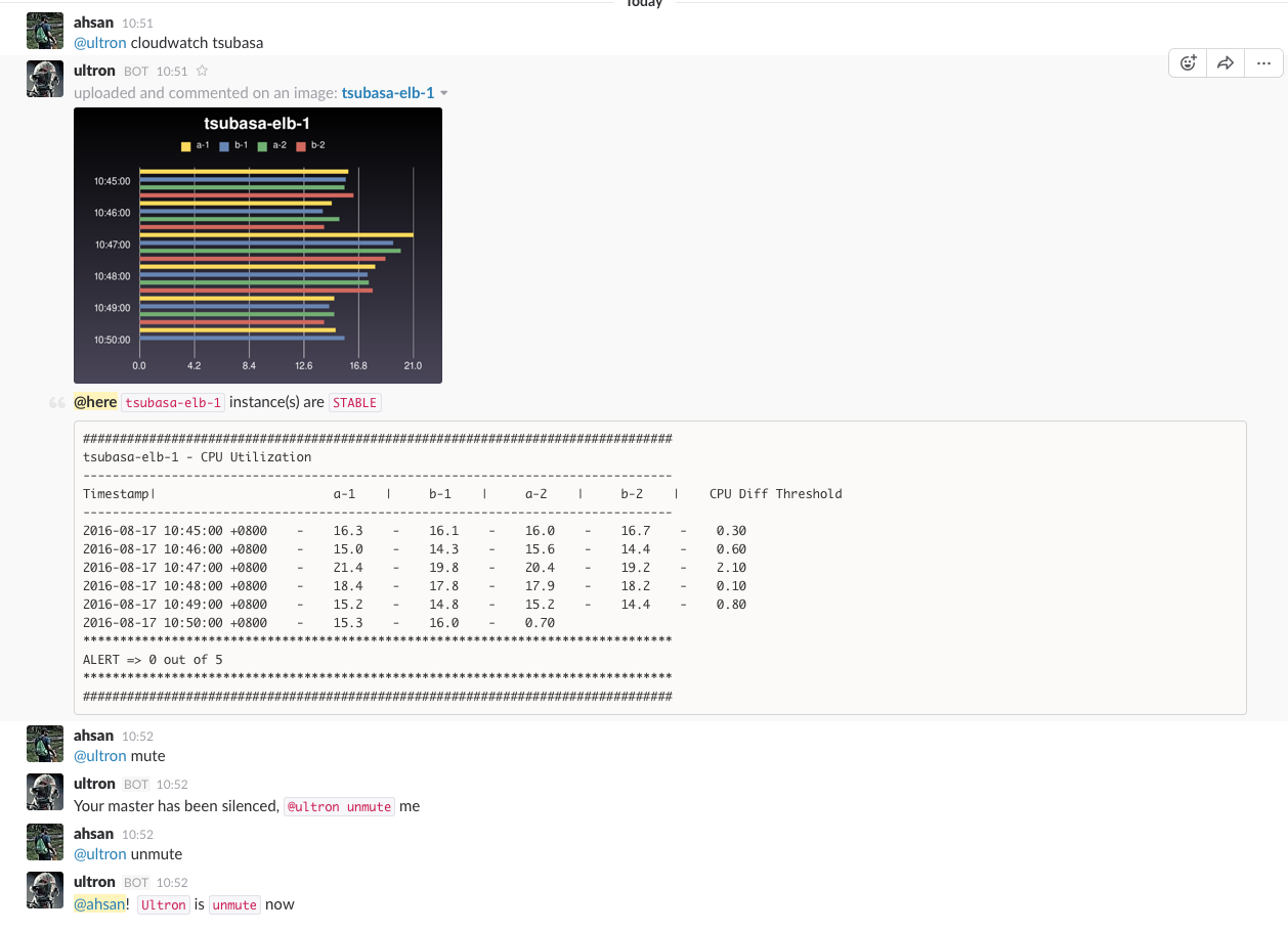 At times an Instance would go down and not all devs have access to AWS Web Console to check which instance is Out of Service or Instance(s) are having high CPU usage. Now they can just ask Ultron with Ultron cloudwatch <elb-name> and get status and usage of the Instance(s) behind an elb.