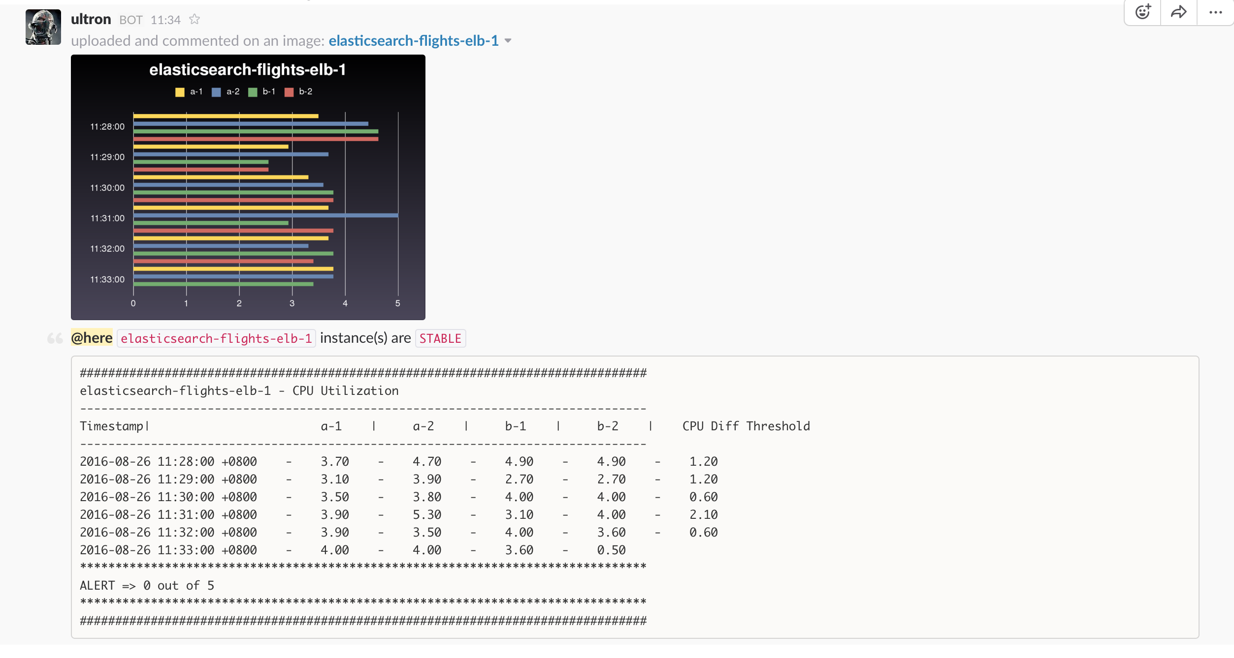This gave us a good opportunity to write our own solution and hook it up with a Slack bot for notifications, considering bots are the most happening thing nowadays. We created a solution to measure the difference between CPU Utilisation for a period of N minutes for all instances on an ELB every M minute (N=5 and M=2 currently in our setup). The alert was configured to be raised if for 80% of N minutes the usage is beyond a predefined threshold. This helped us in not only identifying the instances which were having problem but also services which were not stable and were having spikes in their usage.